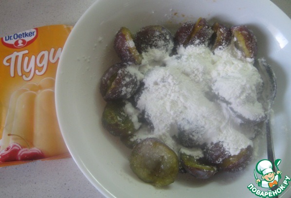 К сливам в сахаре добавляем пудинг, хорошо перемешиваем. -