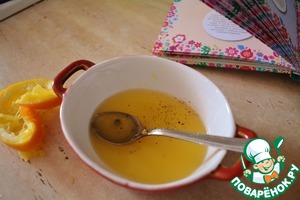 Делаем заправку - для этого смешиваем сок апельсина, уксус и оливковое масло.