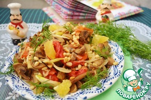 Собираем наш салат - смешиваем в глубокой миске кусочки печеного перца, обжаренные лук и грибы, несколько долек апельсина. Поливаем заправкой, снова перемешиваем и выкладываем на сервировочную тарелку.