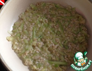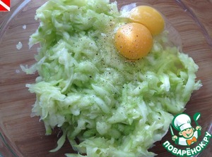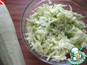 Средний кабачок (у меня был 683 г) помыть, очистить от шкурки и семян. Натереть на средней терке. Слегка посолить, отжать сок.