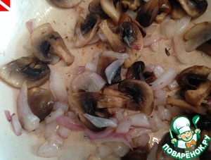 Лук мелко нарезать, поджарить до прозрачности, затем добавить шампиньоны.