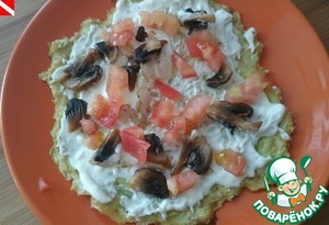 Кабачковый блинчик смазать майонезом, выложить часть грибной начинки, нарезанный помидор.