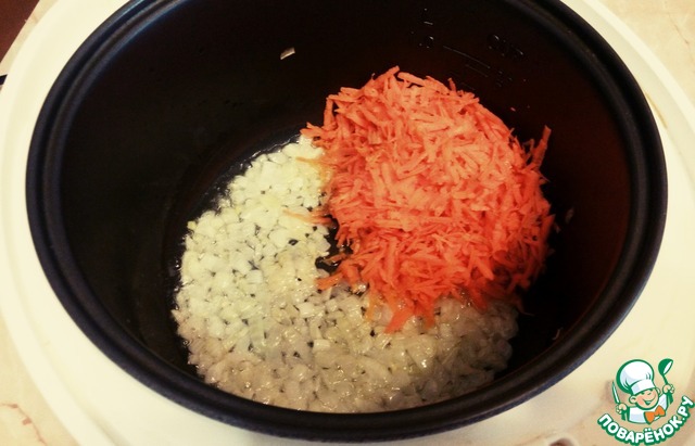 Наливаем подсолнечное масло и после сигнала кладем лук.