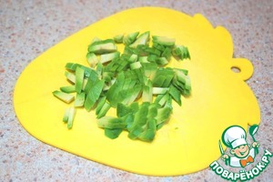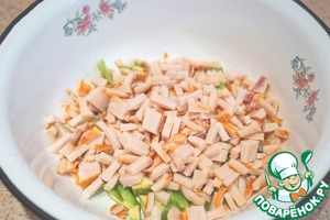 • Подкопченное куриное филе порезать кубиками.