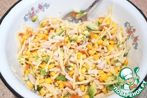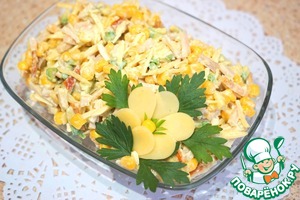 • Добавить консервированную кукурузу, соль по вкусу. Заправить салат майонезом.