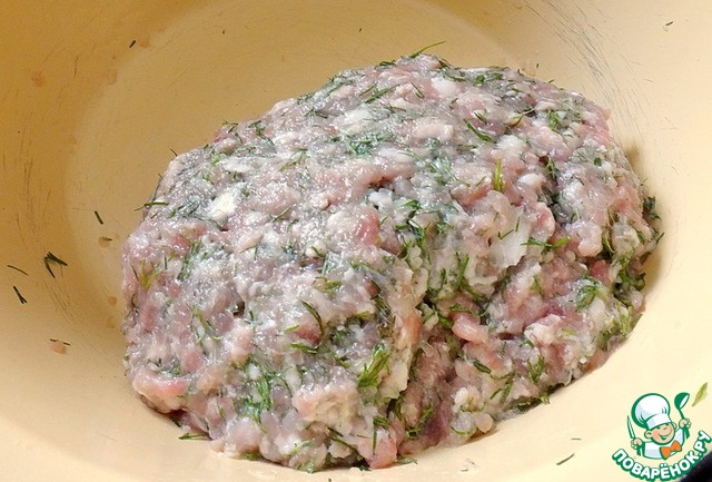 Зелень укропа вымыть, обсушить и мелко нарезать. Добавить нарезанную зелень в фарш. Фарш посолить и поперчить по вкусу, добавить 2-3 ст. ложки ледяной воды и хорошо перемешивать в течение 15-20 минут.