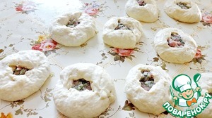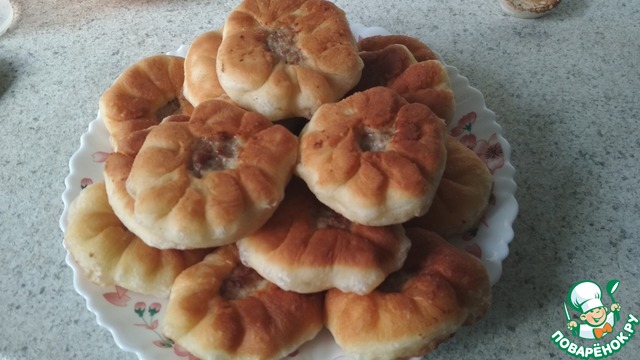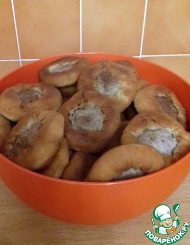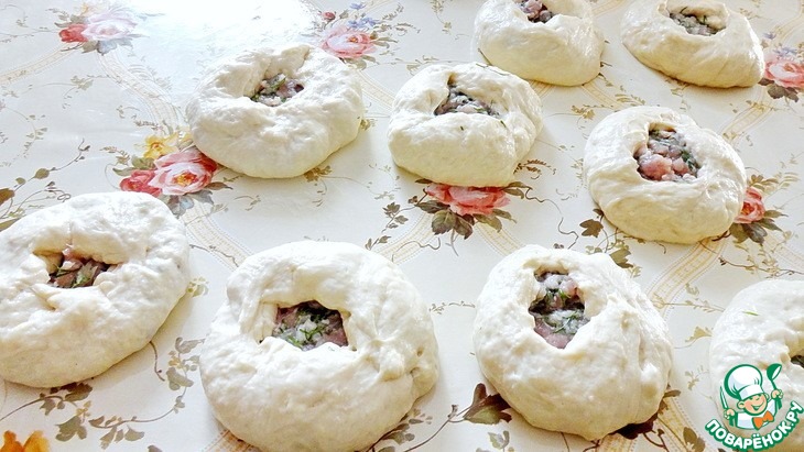 Каждый кусочек размять в лепешечку, выложить в середину неполную ст. ложку фарша и, приподнимая края, сформовать беляш, оставляя открытой середину. -