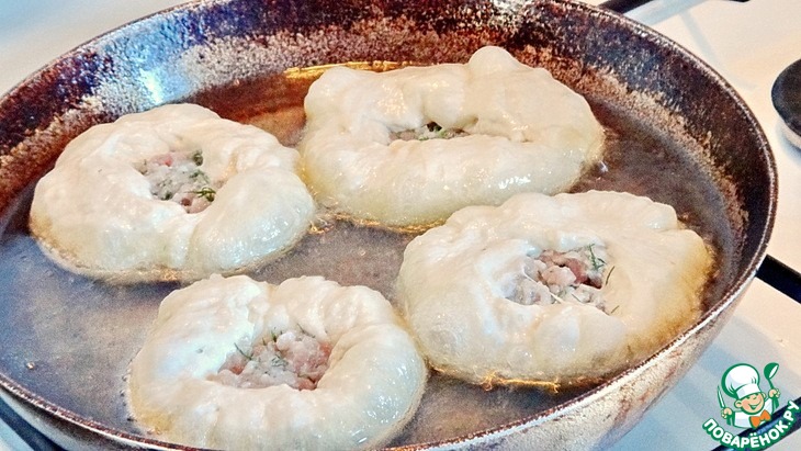 Но на сковороду я выкладывала сначала всё таки дырочкой вниз, так мясо схватывается и бульон остаётся внутри. Если делать наоборот, он вытечет на сковородку при переворачивании.