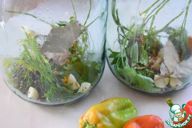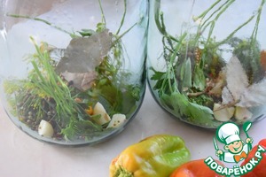 На дно каждой банки положить соцветия укропа, петрушку, 3 лавровых листа, 1 ч. л. семян кориандра, 10 шт. перца-горошка, 3 зубчика чеснока, 1 горький перец. -