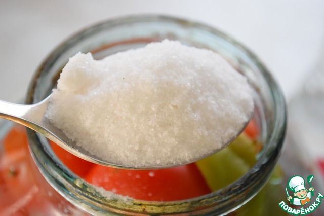 Пока закипает вода, в каждую 3-х литровую банку насыпать по 1 ст. л. соли и 4 ст. л. сахара и по 1 ч. л. уксусной эссенции.