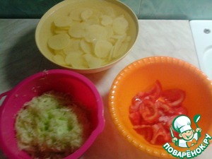Подготовим продукты. Я нарезала картофель кружочками и полу кружочками, кабачок натерла на крупной терке, помидор измельчила. Сначала я пыталась натереть его, но потом решила все-таки нарезать