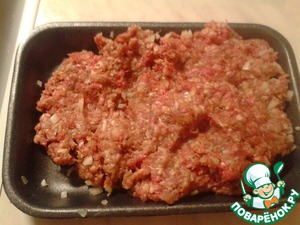 Фарш я купила в магазине, добавила в него нарезаный репчатый лук, посолила и приправила сушеным чесноком и перцем.