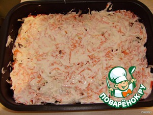 Залить все сметаной или майонезом, а можно сделать сметанно-майонезный соус (просто в равных пропорциях смешать сметану и майонез, в этом случае не перестарайтесь с солью - он есть в майонезе!) и в разогретую духовочку на 15 минут.
