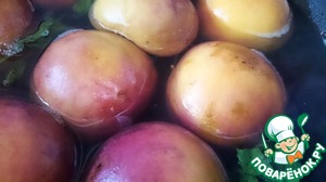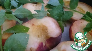 Когда сахар растворится, персики переворачиваем, и держим еще минут 5-10, после чего огонь выключаем, мяту вынимаем, а персики оставляем до остывания.