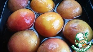 С остывших персиков снимаем кожуру - она должна легко отходить почти сама - и перекладываем в форму, а сверху поливаем образовавшимся сиропом.