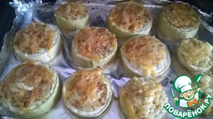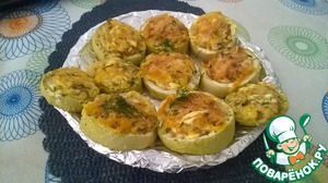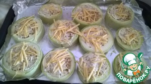 Выложить на противень кабачки, я выпекала на фольге для удобства. Слегка смазать кружочки растительным маслом и начинить фаршем.