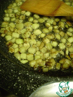 Разогреть масло –не раскаляя чрезмерно –и партиями обжарить кубики баклажанов до легкой румяной корочки. Не пережаривать-будут горчить. И не выкладывать сразу много, иначе баклажаны могут превратиться в кашу. Масла должно быть достаточно именно, чтобы баклажаны жарились, а не подсыхали. И, если в начале баклажаны впитывают масло как губка, одним из признаков готовности баклажанов станет видимый избыток масла на сковороде. Вынуть баклажаны на тарелку, стараясь оставлять масло на сковороде.