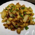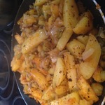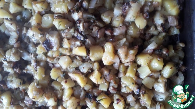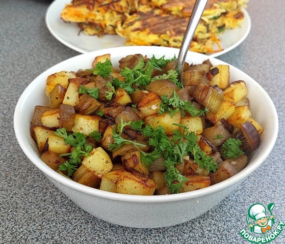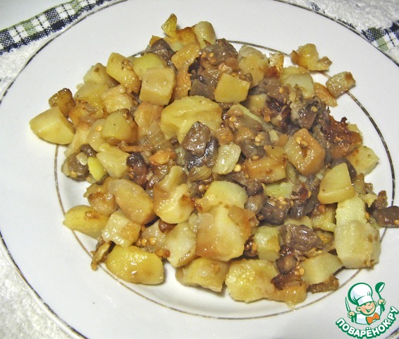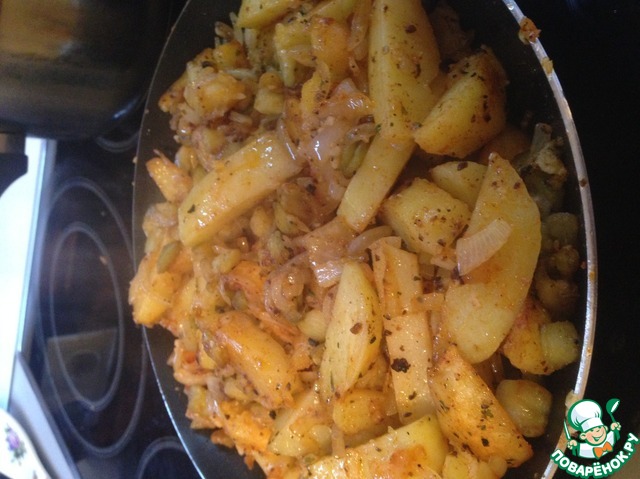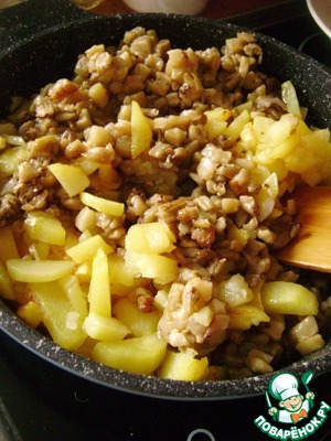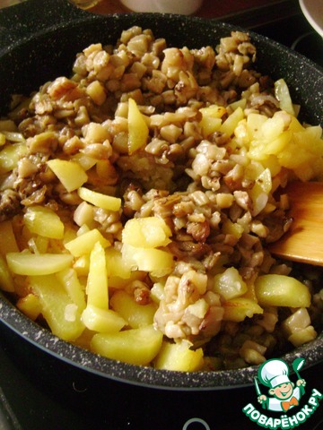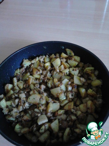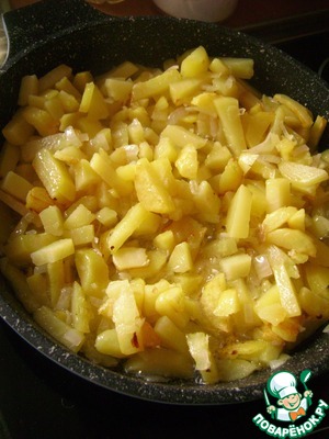 Выложить в сковороду картофель и жарить его с луком до румяности, помешивая.