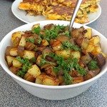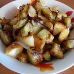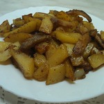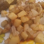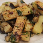 Баклажаны очистить от кожицы и нарезать небольшими кубиками. Я не заморачиваюсь с вымачиванием или посолом баклажанов для удаления горечи, так как нынешние баклажаны давно уже не горчат. Картошку очистить, промыть и обязательно насухо вытереть полотенцем, чтобы при жарке корочка образовалась раньше. Нарезать брусочками в два раза крупнее баклажанов. Лук нашинковать не крупно.