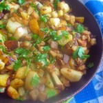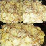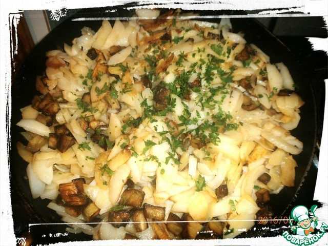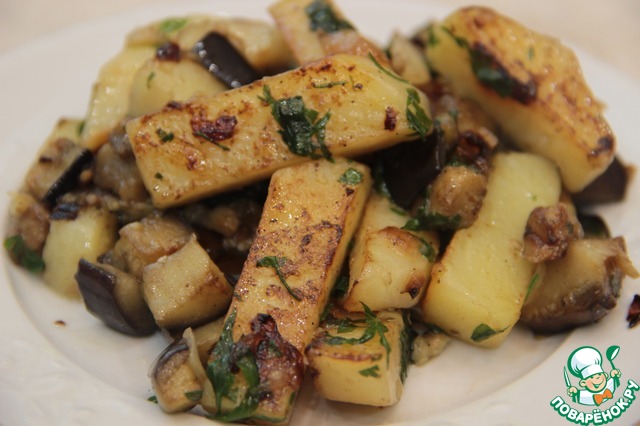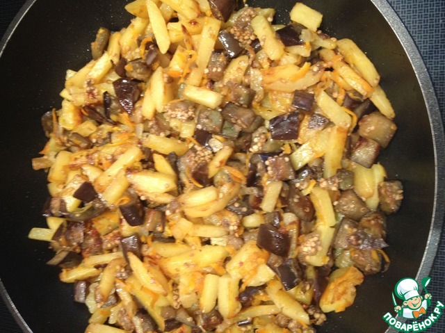 Добавить к картофелю баклажаны, посолить и поперчить по вкусу. Аккуратно перемешать и дать прогреться вместе пару минут.