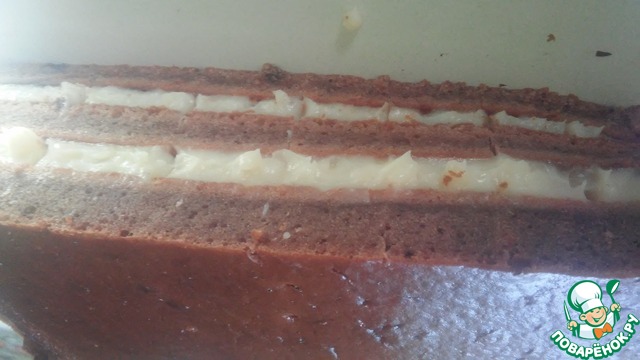 Разрежьте торт на 2-3 части и промажьте кремом.