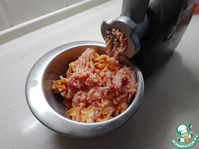Перекручиваем на мясорубке подготовленную индейку добавляя обжаренные овощи