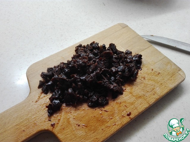Сливаем воду из чернослива. Обсушиваем его на бумажном полотенце, а затем мелко нарезаем.