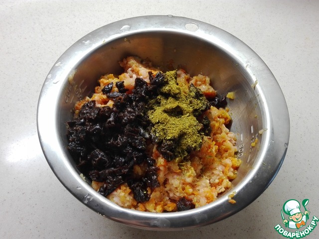 Добавляем к фаршу порезанный чернослив и чайную ложку хмели-сунели.