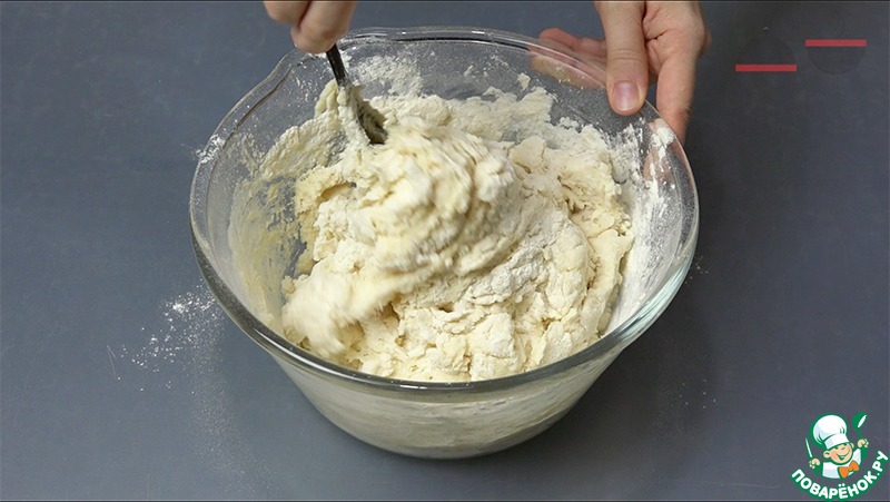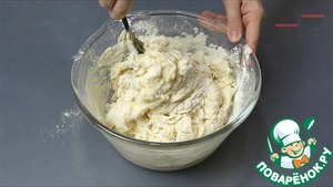 Теперь тесто. Беру часть муки (около 600 г) и перетираю со сливочным маслом. Затем добавляю кефир, сметану, соду, майонез и сахар. Замешиваю тесто, постепенно подсыпая остальную муку. У меня уходит около 1 кг. (плюс-минус 50 г). Тесто должно быть мягким. Долго месить не нужно.