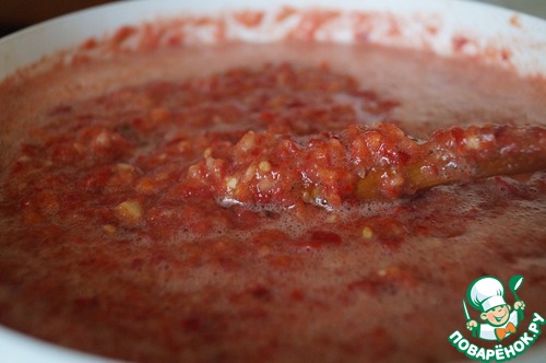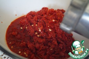 Настала очередь помидоров. Теперь мелем их на мясорубке. Хорошо перемешиваем томатное пюре с перечной массой, добавляем уксус (именно яблочный, никакой другой) и оставляем для созревания на 12 часов минимум при комнатной температуре. Эта приправа носит гордое название "Чертополох", откуда у меня рецепт - даже не помню, давно в блокноте, вроде из старого отрывного календаря, делаю её лет 30. Обратите внимание, что приправа кажется жидкой. В этой приправе - перец, чеснок, соль, помидоры и яблочный уксус. Вот её мне жалко добавлять в полуфабрикаты, она незаменима именно к готовому блюду.