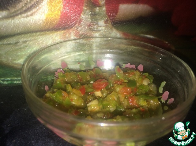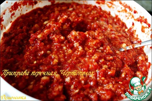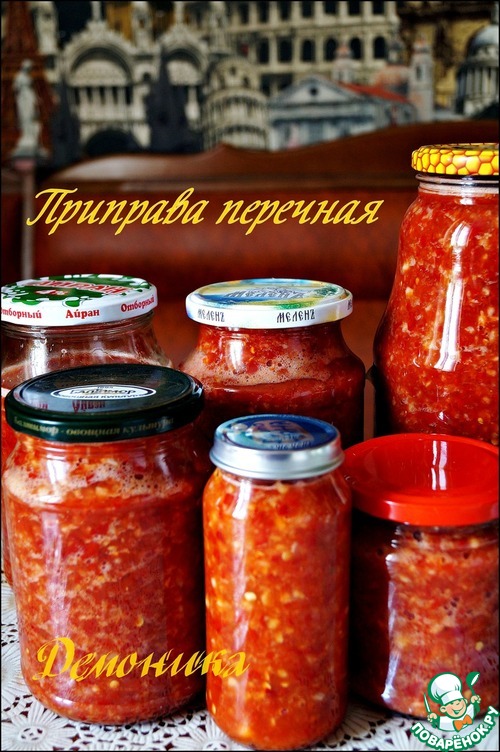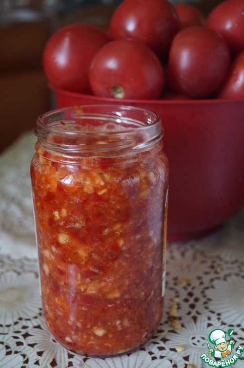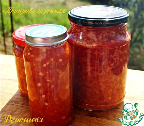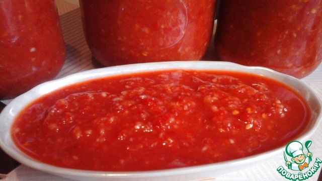 Всё, можно разливать по банкам. Чем дольше приправа стоит - тем более интересный вкус приобретает. Я думаю, вы обратили внимание что делается она не блендером, а значит состоит сплошь из мелких кусочков: чеснок, перец, помидоры, перечные косточки... И в этом её прелесть и свежесть вкуса. После настаивания вкус приобретает гармонию. Вы можете сделать более мелкого помола, но кусочки должны быть пренепременно.