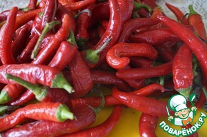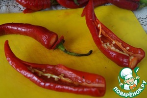 Далее, отрезаем хвостики, расчленяем надрезом и вытаскиваем кокон внутренностей. Особо с семечками не паримся, потому что эту приправу они только украшают. Один мой знакомый - большой любитель одной из перечных приправ, считает, что нужно отрезать только хвостики, потому что в прожилках и косточках - самый аромат и острота. Так что смотрите сами, как воплощать в жизнь все готичные действия по отношению к перцу. Кстати, имейте в виду, что после чистки перца в течение пары дней опасайтесь чесать особо нежные места, типа глаз. Можно, конечно, перчатки, но я не люблю. Готовьтесь к тому. что ручки будет печь довольно долго. Впрочем, это даже полезно.