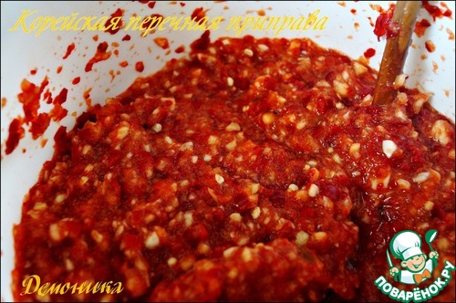 Мой вариант мне нравится куда больше, поэтому корейский вариант я делать не буду и ингредиенты в рецепте даны полностью на второй вариант. Но я откладываю в небольшую баночку и этот корейский вариант, добавляю немного воды и перемешиваю. Эту приправу не жалко добавлять в блюда, поэтому она тоже имеет своё право на существование. А может и найдётся особый любитель тупо перечного вкуса и дурной остроты. Вы тоже отложите немного, хотя бы для сравнения. Мне кажется, что этот вариант будет лучше из зелёного перца. Да и отличить их будет легче. Кстати, употреблять можно немедленно.