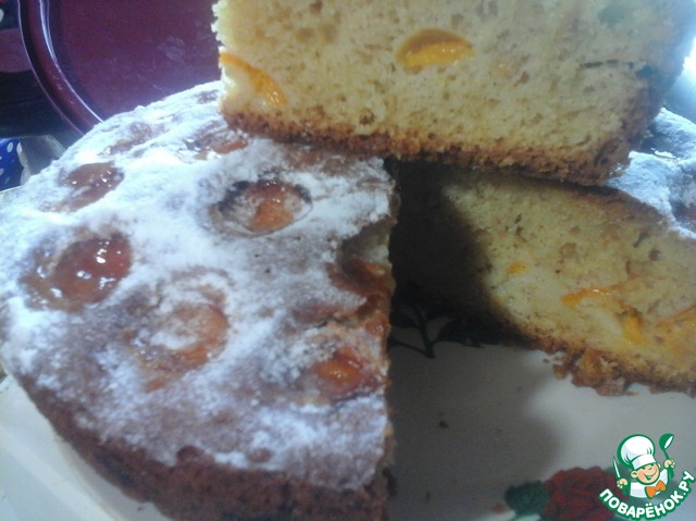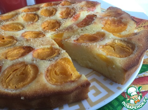 Форму диаметром 28 см смажьте маслом, вылейте тесто, выложите половинки абрикос, срезом вверх. Присыпьте пирог оставшимся сахаром и выпекайте в духовке 45 минут.
