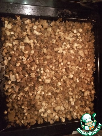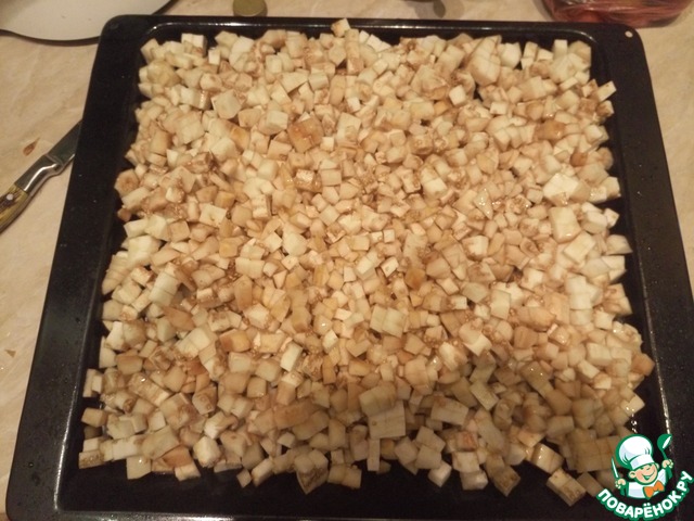 Моем, чистим и нарезаем кубиками наши баклажанчики, а затем отправляем их на обильно политый растительным маслом противень.