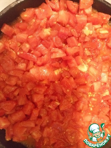 Режем помидорчики кубиками и отправляем в сковородку.