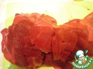 Снимаем кожицу, очищаем от семечек, нарезаем кубиками и отправляем к баклажану.