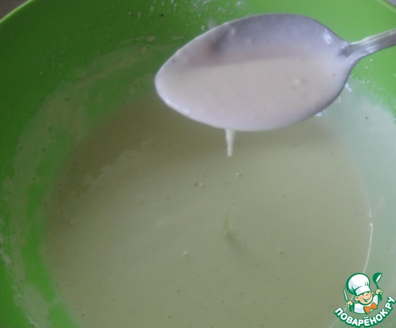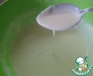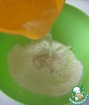 В миску просеять муку, постепенно вливая жидкость, хорошо перемешать до однородного состояния. -