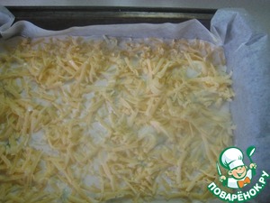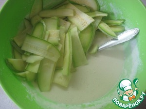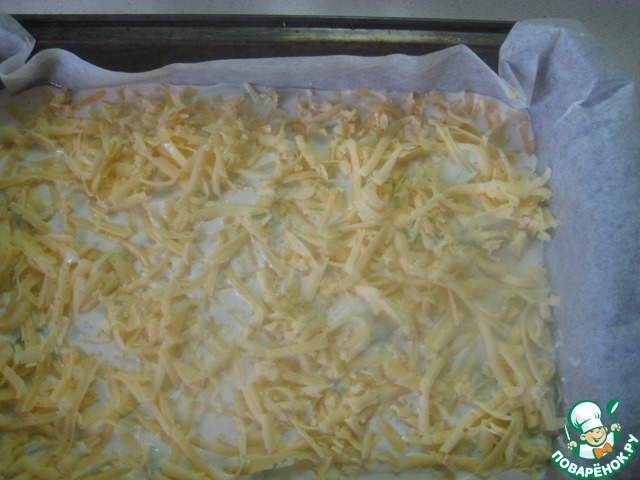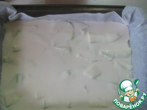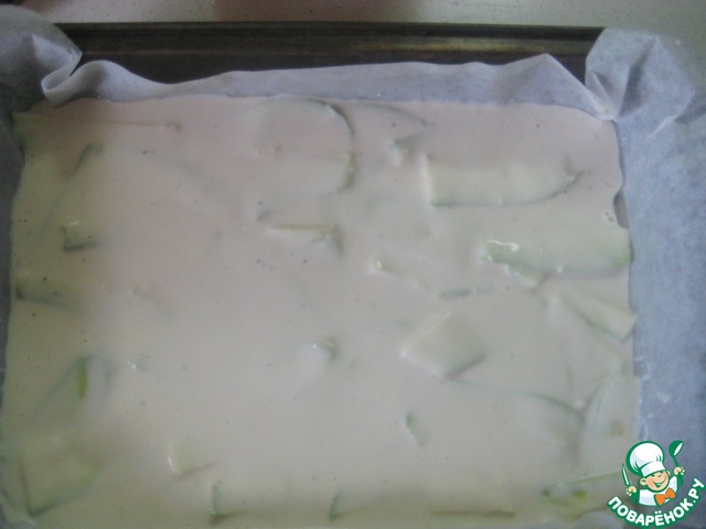 Противень или удобную форму для выпечки застелить пергаментом. Выложить тесто, распределяя кабачки равномерно по всей форме.