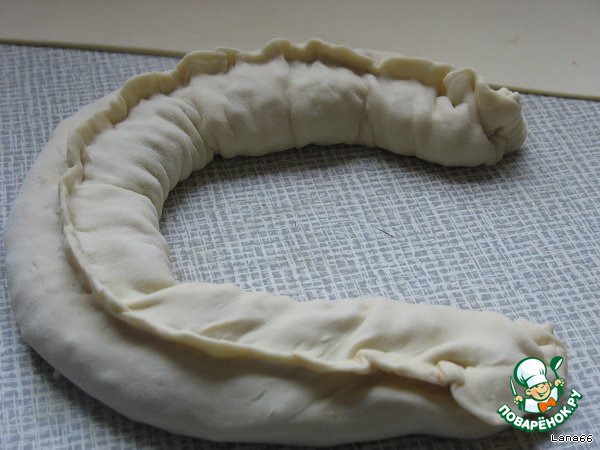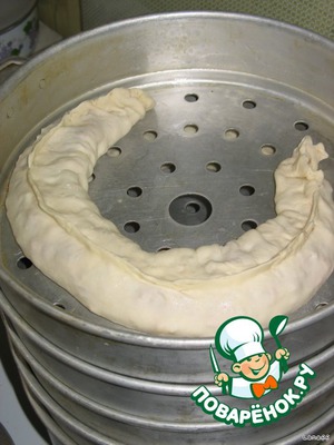 На смазанный круг мантоварки в полукруг разместить тесто с начинкой.