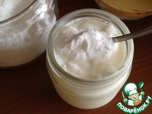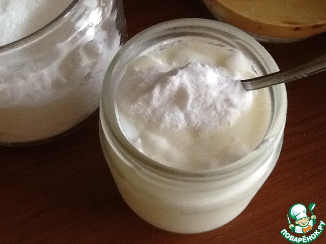 Соду положим в йогурт (у меня домашний натуральный, можно любой кисломолочный продукт)