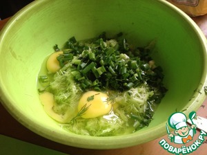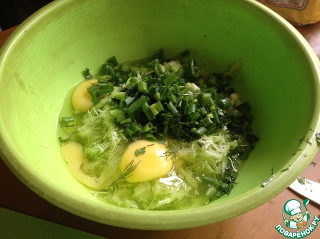 Кабачок вымыть, обсушить, натереть на мелкой тёрке. Зелень вымыть, обсушить, измельчить. Смешать кабачок, петрушку, укроп, зелёный лук, яйца.