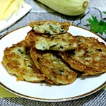 Кабачковые оладьи готовят, наверно, все хозяйки. Хочу предложить свой вариант. Когда-то я их готовила так, как это делала мама: кабачок на крупной тёрке, яйцо, вода, соль и мука. У знакомой попробовала и мне они понравились больше - вода исключалась, количество яиц увеличивалось. По структуре они были более нежные. Как-то на даче был один кабачок, а накормить надо было сына и свекровь. Пошла на огород и нарвала зелень. Добавила. А также добавила остатки сыра - хранить холодильника не было. Результат очень порадовал. С тех пор так и готовлю.