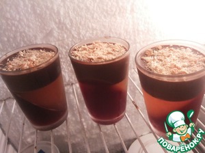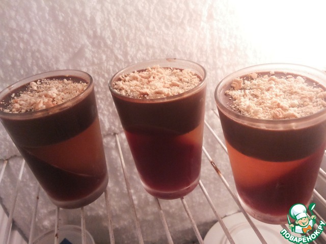 В формочки налить слой фруктового желе, охладить до застудневания, затем слой молочно-шоколадного, охладить.