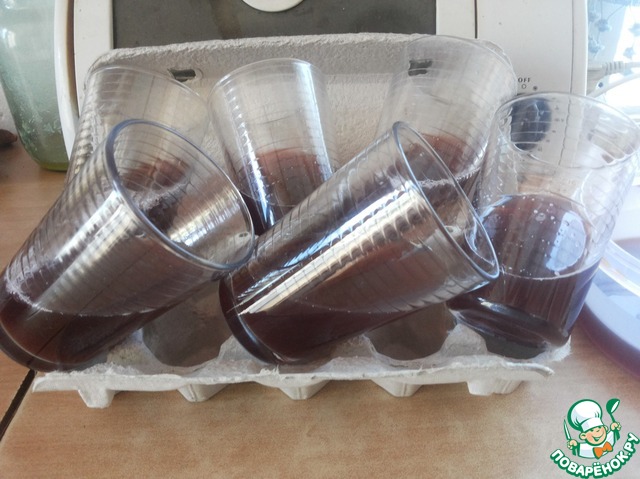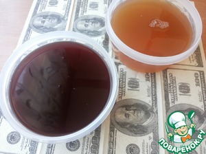 Я взяла вишневый сок и яблочный пополам, растопленный желатин разлила в сироп и сок -