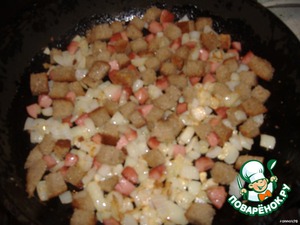 Хлеб, лук и колбасу нарезать кубиками, обжарить на растительном масле.