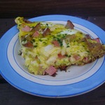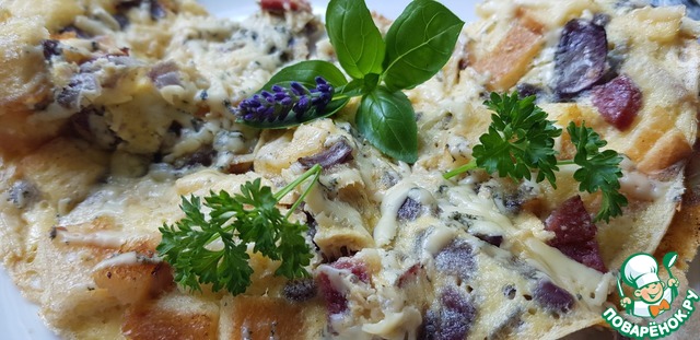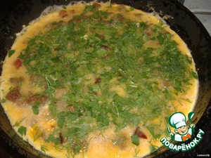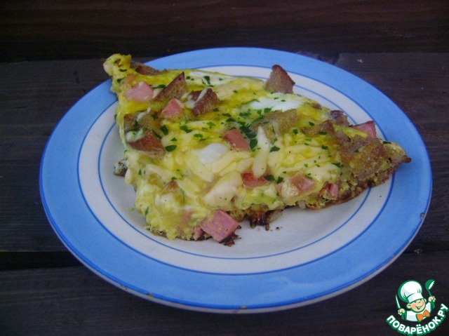 Готовить нужно на среднем огне, и следить, чтобы низ не подгорел. Я обычно протыкаю в нескольких местах ножом или лопаточкой и немножко отодвигаю, чтобы жидкость стекла вниз. А вообще, в готовом виде яичница напоминает пиццу. Сами увидите.