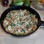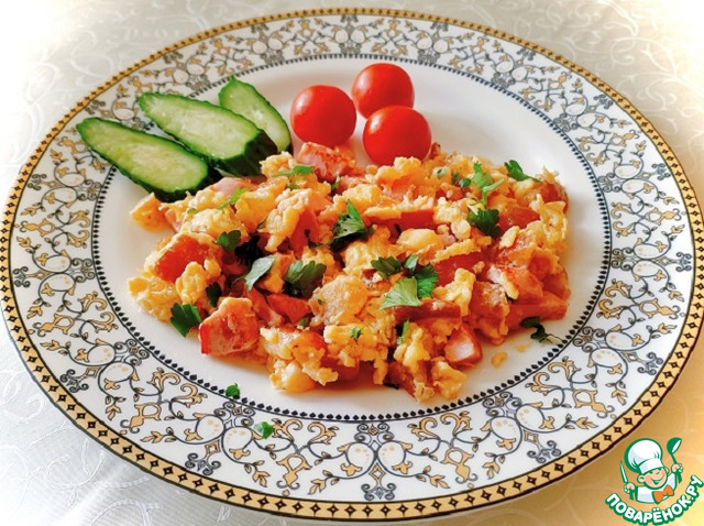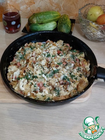 Существует много разновидностей яичниц, на завтрак - незаменимая вещь, каждый раз я их делаю по-разному, в зависимости от продуктов, имеющихся в холодильнике. Представляю одну из них.