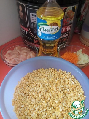 Горох хорошо промыть. Куриное филе нарезать небольшими кусочками. Морковь натереть на терке, а лук мелко нарезать. -