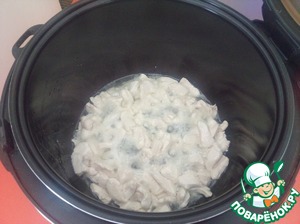 В чашу мультиварки влить растительное масло и выложить нарезанное куриное филе. Готовить на режиме Жарка 10 минут.